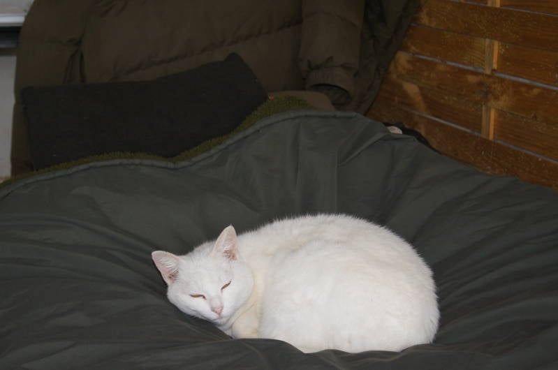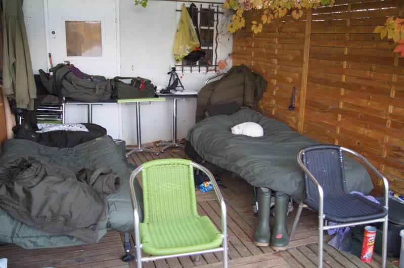 Rob en Rico vissen op stek 25. Op deze stek staat de schuur van de eigenaar met een klein afdakje. We hoeven de tenten niet eens op te zetten want hier hebben we een prima onderkomen aan. Er leeft een witte kat en die was deze week Ricó's grootste vriend. Sliep ook lekker op z'n stretcher. Lekker hoor....