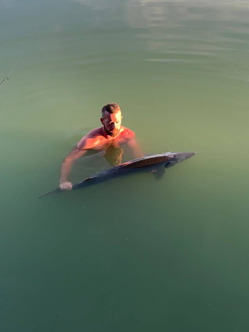 En nu wachten op de avond. De koelte. Slapen onder de sterren want een tent is niet nodig. Wat is het heerlijk nu. Geen zuchtje wind. Geen muggen. En ook gelijk de eerste avond een spiegel vangen en 's nachts een enorme steur! We wisten dat ze er zaten. Waren van plan met één hengel gericht erop te gaan vissen, maar dit is niet nodig. Ze pakken alles en zijn erg actief deze dagen. Meerdere komen er aan de lijn en de meesten worden verzilverd. Deze eerste wordt een onvergetelijke dril waarbij de dino zich probeert te ontdoen van haak en lijn door om de paal te zwemmen op de steiger waar wij op staan. Dus de hele hengel er maar omheen gevouwen, liggend op de buik. Warempel, het lukt nog ook!