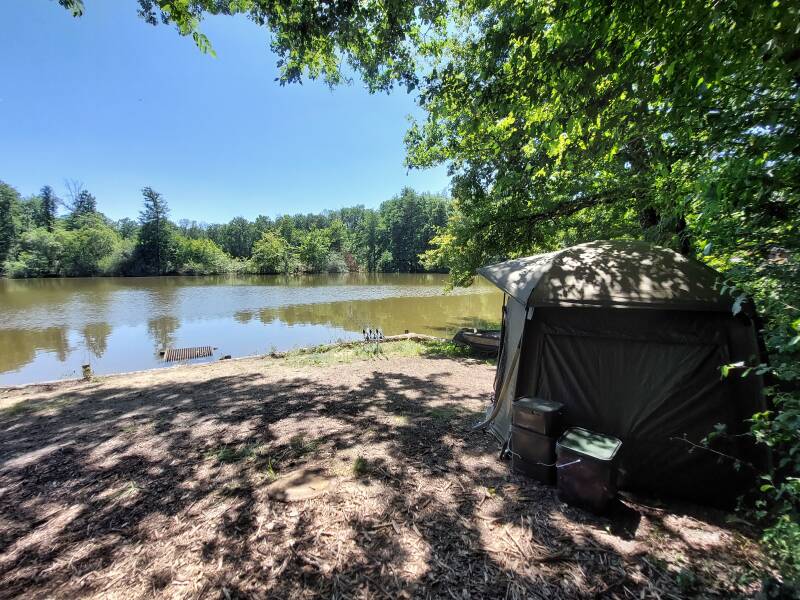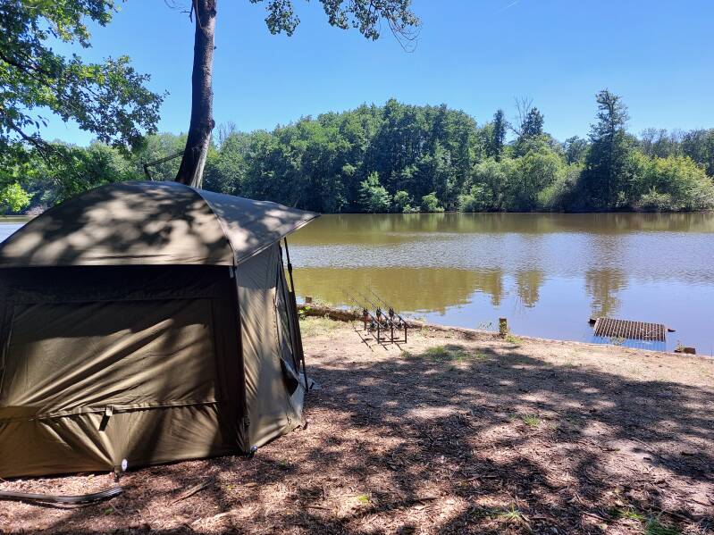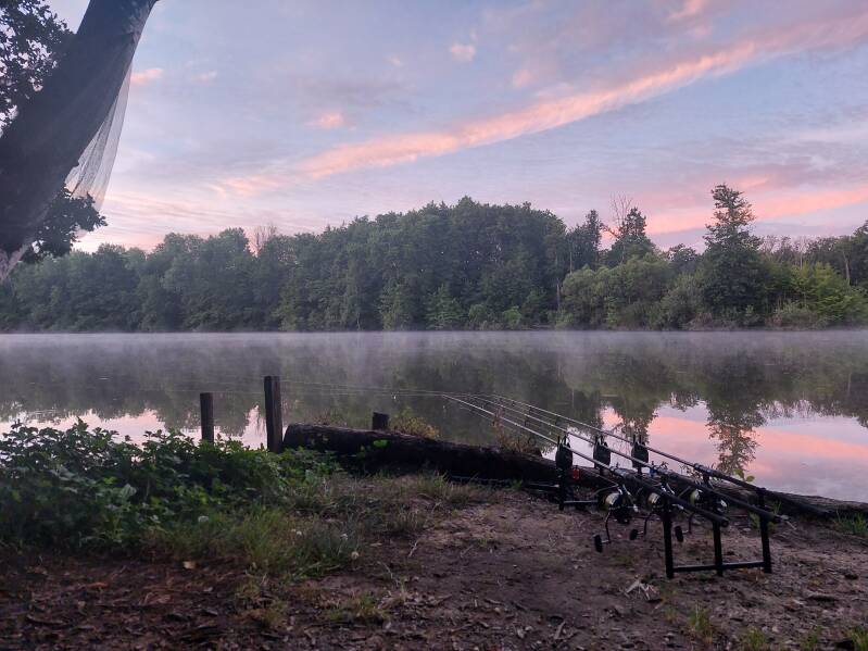 We zijn niet de enigen. Er is nog een Nederlands stel. Zij nemen plaats op de achterste stekken van de grote plas, wij de voorste. Hier hebben we vorige sessie één nacht gevist als afsluiter en verdomd goed gevangen. "Dus dat gingen we nu ook wel eventjes doen!"