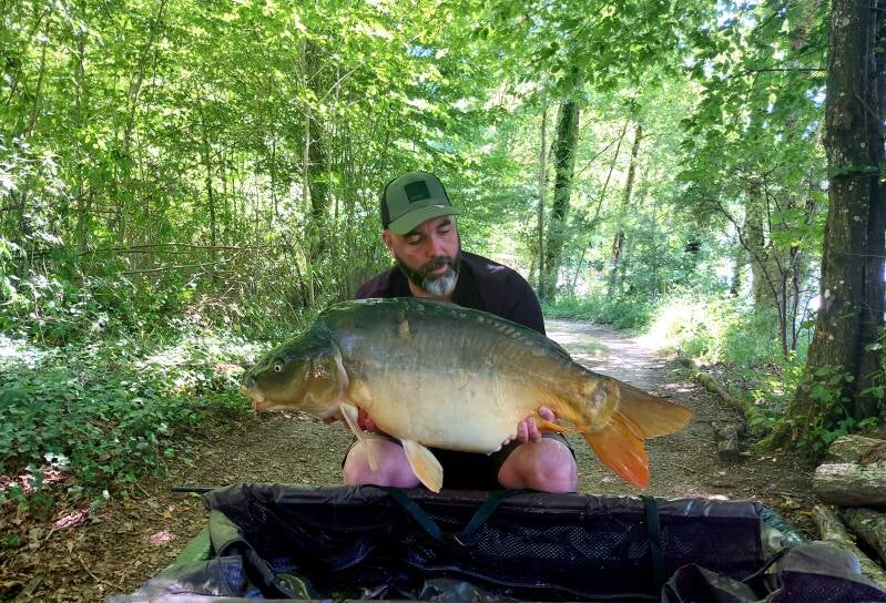 Nou... dat liep anders. We hebben in deze dagen helaas maar één karper kunnen vangen. Wel een prachtige dikke spiegel, op het heetste moment van de dag. Keurig door Rico gevangen op de hengel van Rob. Want die was even een stukje wandelen....hij ging toch niet.... en toen toch. Geschreeuw van Jon in de verte, een enorme sprint naar de stek en ik zag hem nog net over het koord in het netje verdwijnen. Het is je gegund makker.